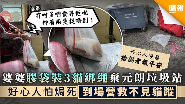 【狠心棄貓】婆婆膠袋裝3貓綁繩棄元朗垃圾站 好心人怕焗死到場營救不見貓蹤