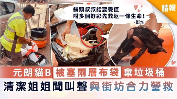 【於心何忍】元朗貓B被塞兩層布袋棄垃圾桶 清潔姐姐聞叫聲與街坊合力解救